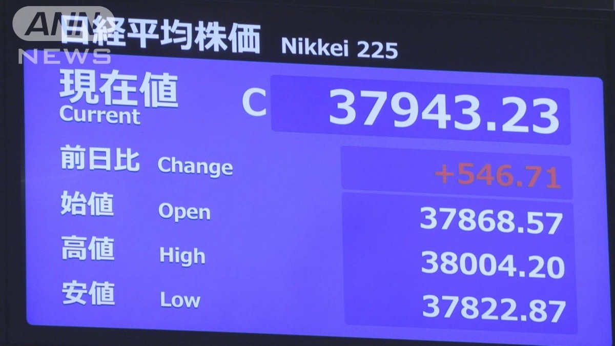 午前の終値は17日に比べ546円高い、3万7943円でした。