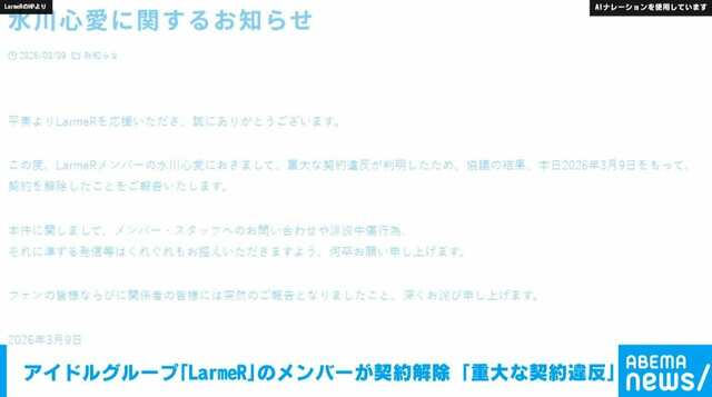 アイドルグループ「LarmeR」のメンバーが契約解除 「重大な契約違反」