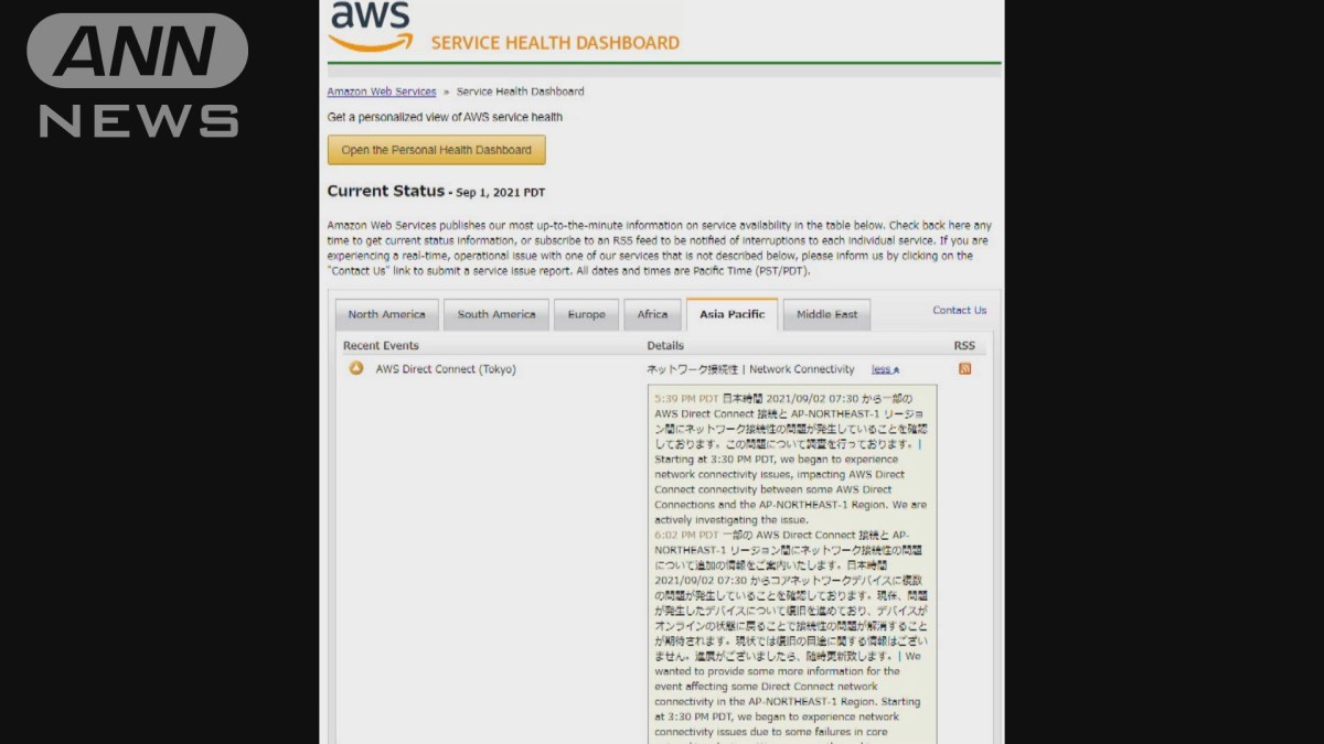 アマゾンの子会社「アマゾン・ウェブ・サービス」によりますと、2日午前7時半ごろからネットワークの接続に不具合が発生しました。