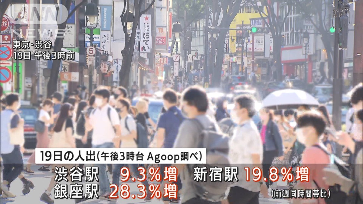 午後3時台の東京都内の人出は1週間前の日曜日と比べて渋谷駅で9.3%、新宿駅で19.8%、銀座駅で28.3%増えました。