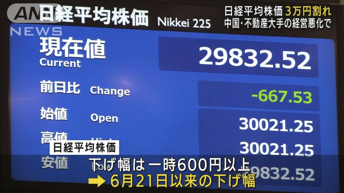東京株式市場の日経平均株価が下落し、3万円の大台を一時、割り込みました。中国の不動産大手「恒大集団」の経営悪化の懸念から売られています。