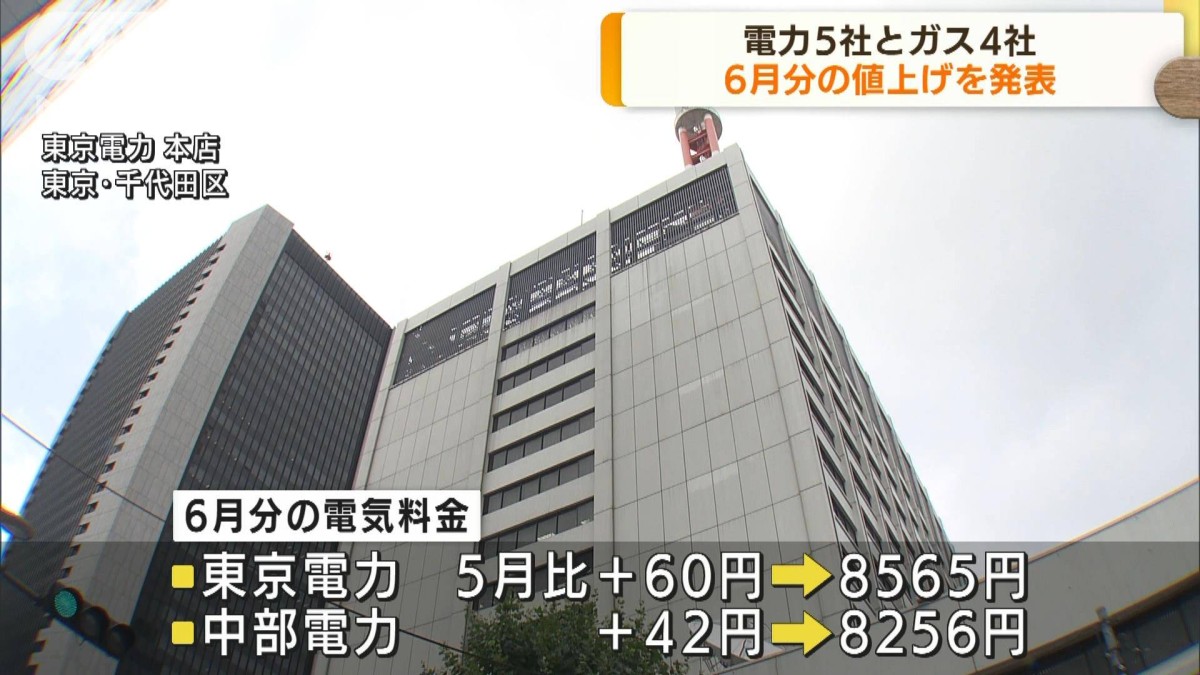 天然ガスや原油など燃料価格の高騰を受けて、電力大手5社と都市ガス大手4社が、6月分の値上げを発表しました。