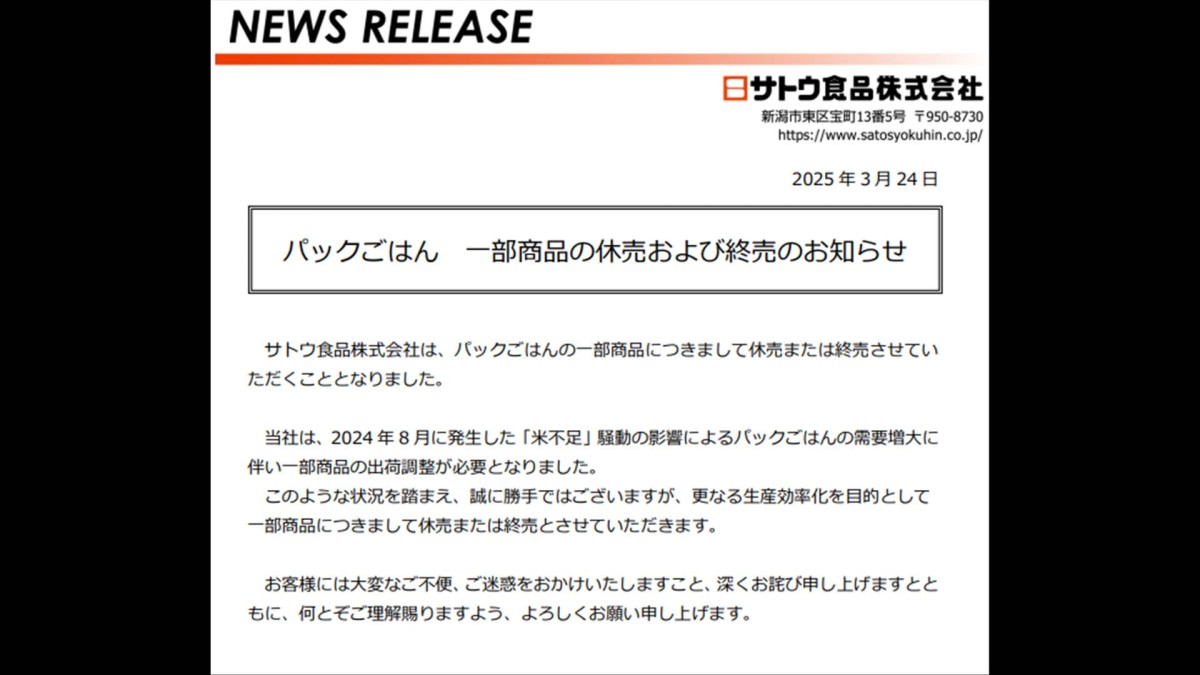 サトウ食品は「米不足」による出荷調整のため、一部のパックご飯の販売を終了すると発表しました。
