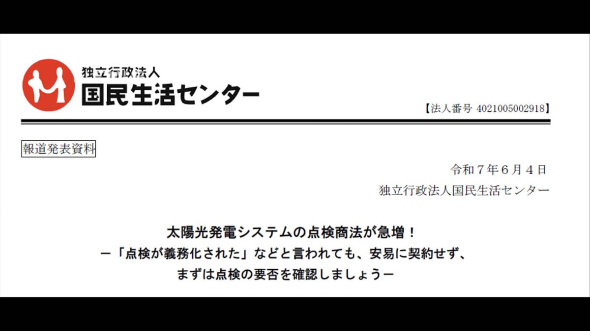 「太陽光パネルの点検が義務化された」などとうたい、点検時に高額な契約を勧誘されるといったトラブルに注意が呼び掛けられています。