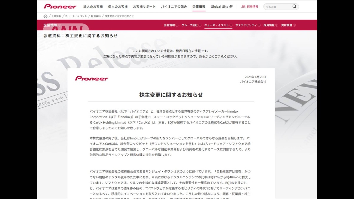 パイオニアは、台湾の液晶大手「イノラックス」の子会社で、車載用ディスプレイを手掛ける会社の傘下に入ると発表しました。