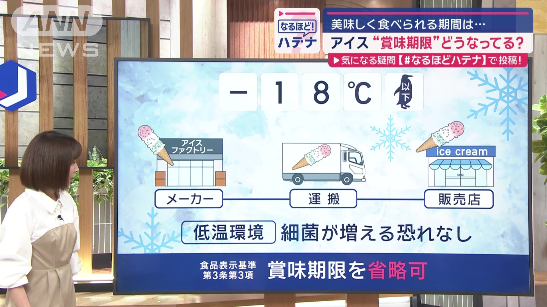 そもそも、なぜ賞味期限の表示がないアイスがほとんどかというと、アイスはメーカーでの保管、運搬、お店に並んでいる時、すべての工程で−18℃以下が保たれています。