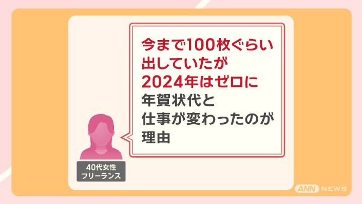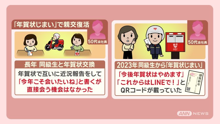 経済 モーニングショー 2024年12月17日 16:45 『年賀状じまい』急増!「やめてよかった」関連グッズも好評 一方で続けるワケとは? 2024年12月17日 16:45 広告 1■『年賀状じまい』急増中!背景に年賀はがきの値上げも この記事の写真は20枚 ■『年賀状じまい』したけれど「後悔」や「困惑」の声も ■8割以上が「年賀状じまいしてよかった」同級生と親交復活も ■失礼なく伝える『年賀状じまい』オススメの書き方 ■はがきにシール「年賀状じまいグッズ」が大好評 ■枚数を絞って出す人も 年賀状続ける人 理由は? ■あなたは大丈夫?『自己満年賀状』に注意 (「羽鳥慎一モーニングショー」2024年12月16日放送分より) この記事の写真を見る(20枚) ・ きょうから年賀状受け付け 1枚85円に 発行枚数もさらに減少・年賀状15日から引き受けも…やめる企業およそ半数に・値上げ影響“年賀状じまい”も急増 今年は出す?出さない?それとも…・株価大幅下落で新NISA「損切り民」が続出?・金価格上昇で結局トクした?「10万円金貨」 財テク長期投資の“夢の跡” スクープ投稿 トップ 経済 記事