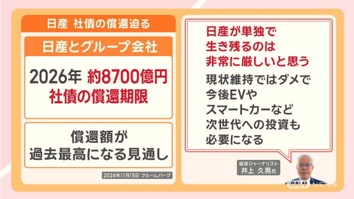 経済 モーニングショー 2025年2月11日 16:45 日産、ホンダと経営統合『白紙』の舞台裏 「鴻海」に買収の動き?再建への道筋は? 2025年2月11日 16:45 広告 1■ホンダ・日産 経営統合白紙へ 一体何が?現場の『本音』とは この記事の写真は15枚 ■北米・中国で苦戦 日産が単独で生き残れる可能性は? ■台湾企業「鴻海」に買収の動き?日産を狙うワケ ■日産 大株主ルノーからの支援は? ■日産 アメリカのテック企業とタッグの道も?専門家が提言 (「羽鳥慎一モーニングショー」2025年2月10日放送分より) この記事の写真を見る(15枚) ・【ニュースをわかりやすく】TVerにて羽鳥パネル 見逃し配信中!・ホンダ・日産の統合白紙へ 子会社化案に反対相次ぎ・協議発表時から不穏な場面も…ホンダの『子会社化案』に日産反発 統合“白紙”へ・“トランプ関税”カナダ・メキシコ・中国に導入目前…揺れる“日本車の街”・中国の日系自動車メーカー3社 去年の新車販売は前年割れ 新エネ車の強化で巻き返し スクープ投稿 トップ 経済 ビジネス 記事
