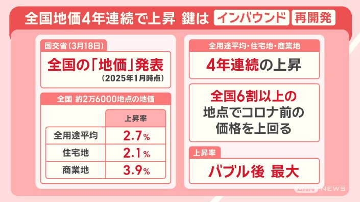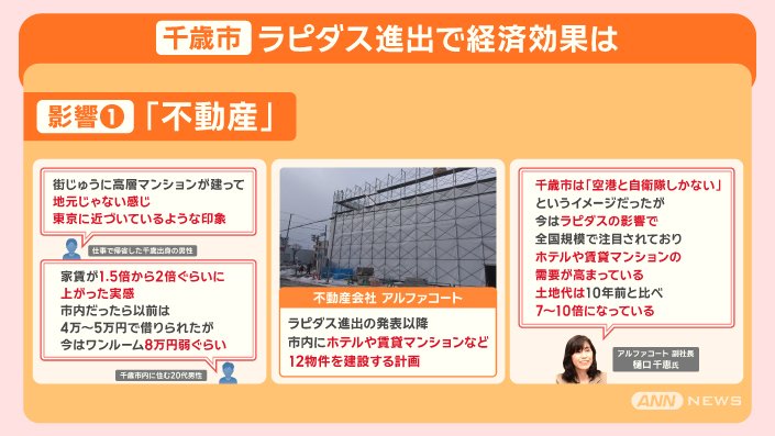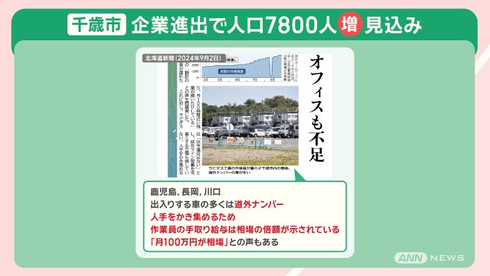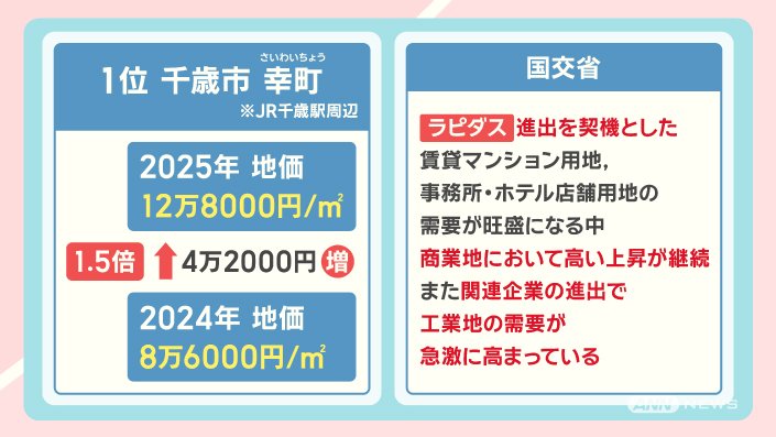 経済 モーニングショー 2025年3月20日 16:00 地価上昇率トップ3独占の千歳市 空前の建設ラッシュで月給相場100万円も!? 2025年3月20日 16:00 広告 1■全国の地価 バブル期以来の伸び 要因はインバウンドと再開発 この記事の写真は13枚 ■半導体特需『ラピダス』進出で沸く北海道千歳市が上昇率1位 ■空前の建設ラッシュ「月給100万円が相場」道外から作業員殺到 ■千歳市 ラピダス効果で高層ビル続々 売り上げ増の飲食店も (「羽鳥慎一モーニングショー」2025年3月19日放送分より) この記事の写真を見る(13枚) ・【ニュースをわかりやすく】TVerにて羽鳥パネル 見逃し配信中!・全国地価4年連続で上昇 上昇率1位は北海道千歳市・東京23区の地価上昇率3位に“下町”足立区綾瀬・東京23区の新築マンション 10カ月連続で1億円超・“第2のニセコ”白馬に海外投資家が注目 土地価格は全国トップ上昇率もゴミ問題噴出 スクープ投稿 トップ 経済 記事