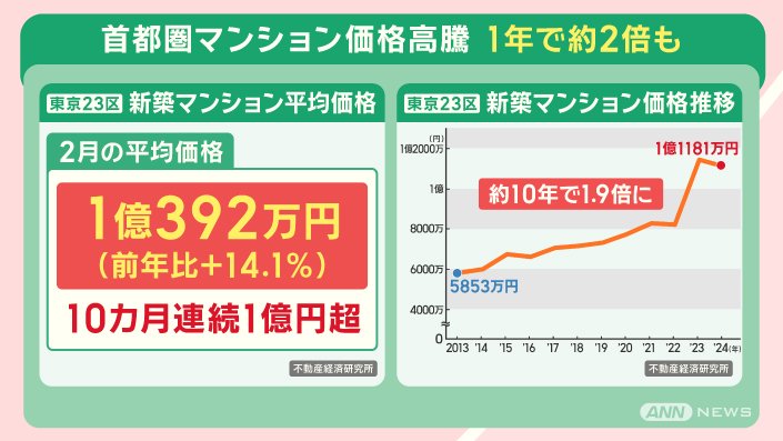 新築マンションの高騰が続き、東京23区の2月の平均価格は10カ月連続で1億円超え、高値は23区の近郊にも波及しています。