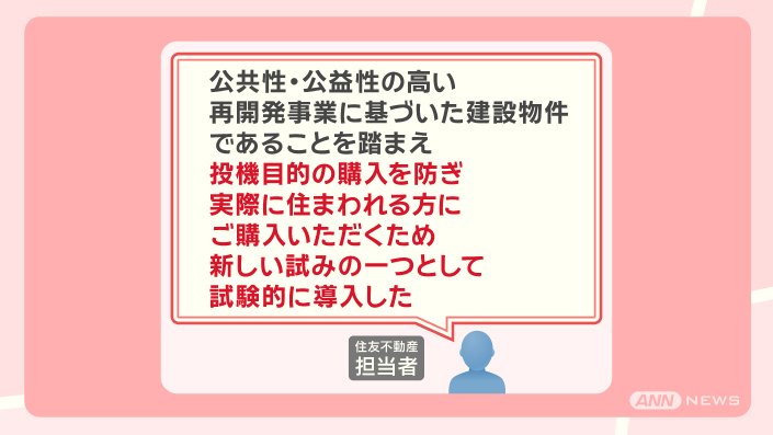 「公共性・公益性の高い再開発事業に基づいた建設物件であることを踏まえ、投機目的の購入を防ぎ、実際に住まわれる方にご購入いただくため、新しい試みの一つとして試験的に導入した」