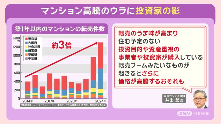 「転売のうま味が高まり、住む予定のない投資目的や資産重視の事業者や投資家が購入している。転売ブームみたいなものが起きると、さらに価格が高騰するおそれも」
