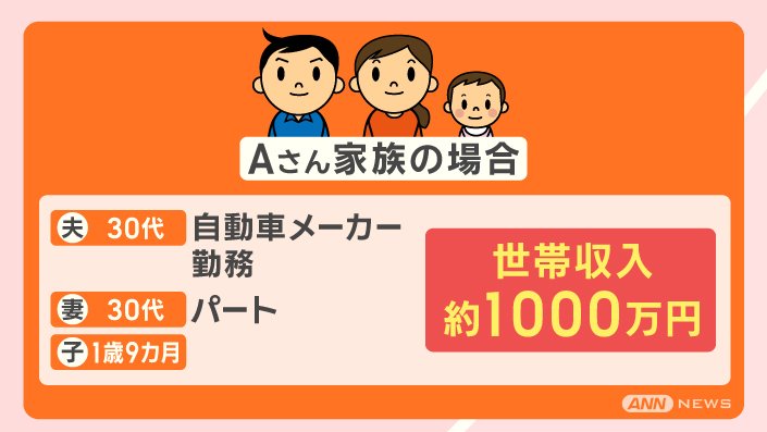 夫は30代で自動車メーカー勤務、妻は30代でパート、子どもは1歳9カ月の3人家族です。