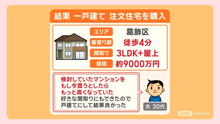 「検討していたマンションを、もし今買うとしたら、もっと高くなっていた。好きな間取りにもできたので、戸建てにして、結果良かった」と話しています。