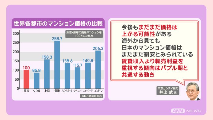 「今後もまだまだ価格は上がる可能性がある。海外から見ても、日本のマンション価格は、まだまだ割安とみられている。賃貸収入より転売利益を重視する傾向は、バブル期と共通する動き」ということです。