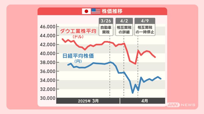 4月2日に、相互関税の詳細を発表すると大きく下がり、4月9日に、相互関税の一時停止を発表すると上がるなど、乱高下しています。