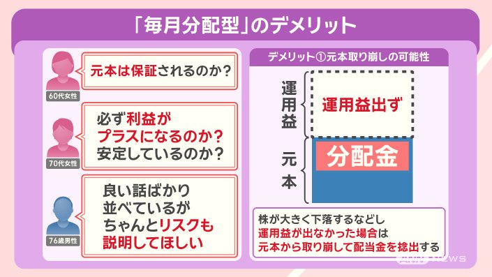 この『プラチナNISA』は、少額から行える投資で、元本を元手に得た運用益、つまり利益の一部を、毎月『分配金』として利用者に払い戻す『毎月分配型』というシステムです。