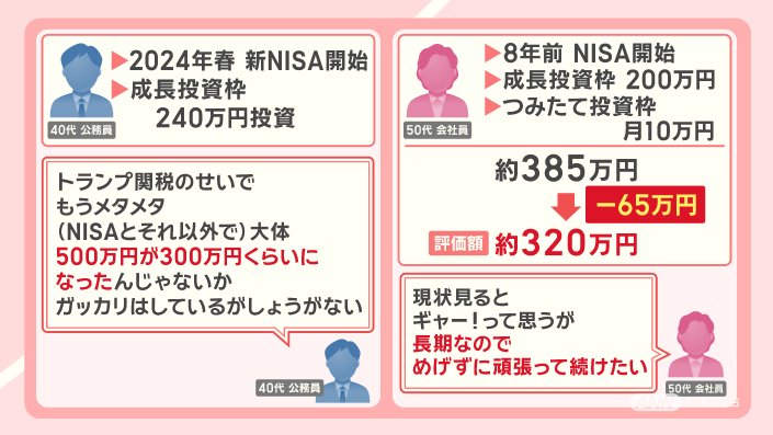 「トランプ関税のせいで、もうメタメタ。(NISAとそれ以外で)大体500万円が300万円くらいになったんじゃないか。ガッカリはしているが、しょうがない」と話しています。