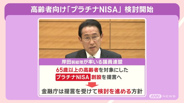 4月16日、岸田前総理が率いる議員連盟は、65歳以上の高齢者を対象にした『プラチナNISA』の創設を提言する考えを示しました。