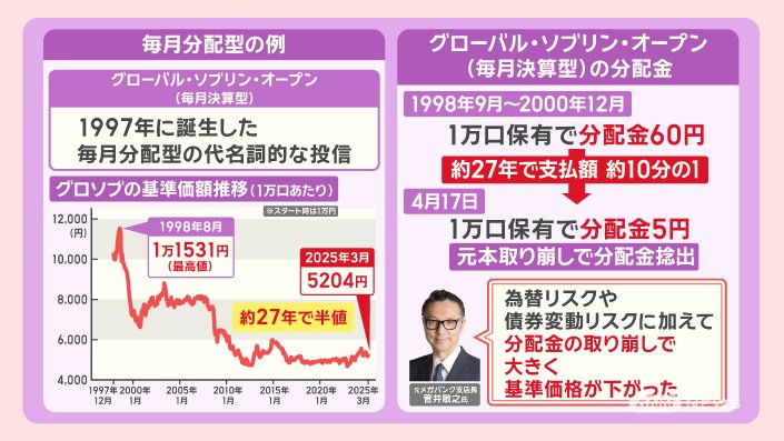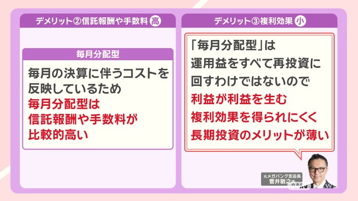 「『毎月分配型』は、運用益をすべて再投資に回すわけではないので、利益が利益を生む複利効果を得られにくく、長期投資のメリットが薄い」ということです。