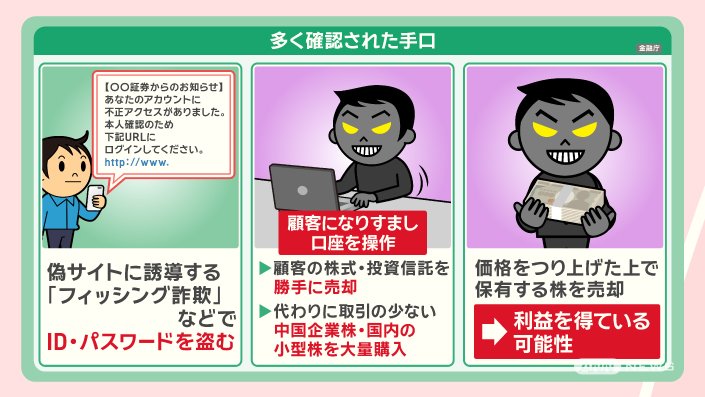 証券会社の偽サイトに誘導する『フィッシング詐欺』などで、IDやパスワードを盗みます。
