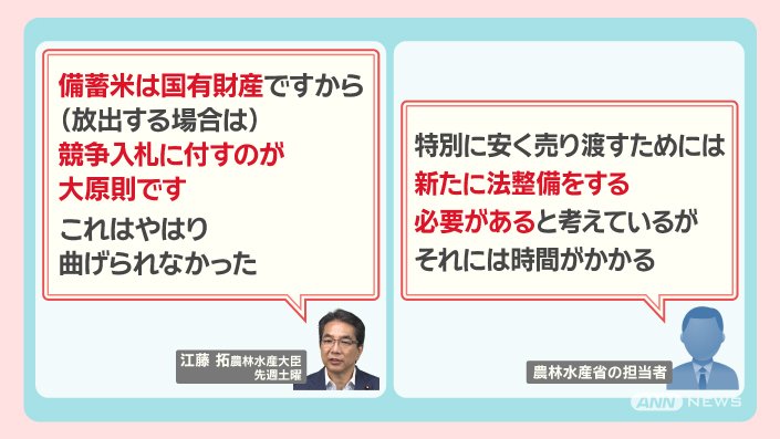 「備蓄米は国有財産ですから、(放出する場合は)競争入札に付すのが大原則です。これはやはり曲げられなかった」としています。