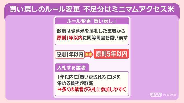 政府は備蓄米を落札した業者から、原則1年以内に同等同量のコメを買い戻す、というルールがありますが、原則1年以内というルールを、原則5年以内に延長します。