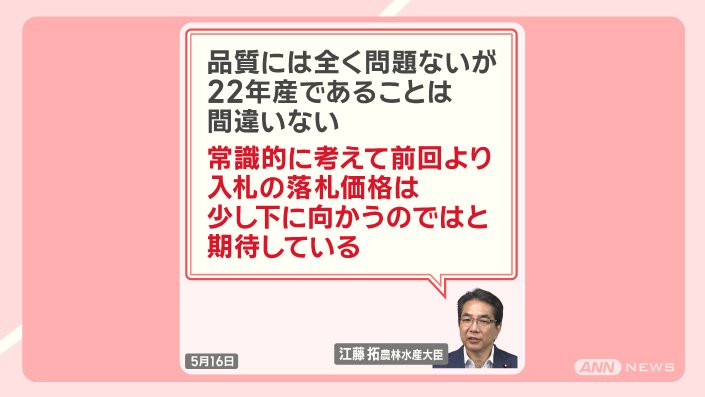 「品質には全く問題ないが、22年産であることは間違いない。常識的に考えて前回より入札の落札価格は少し下に向かうのではと期待している」としています。