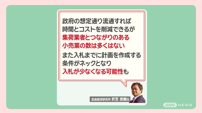 「政府の想定通り流通すれば、時間とコストを削減できるが、集荷業者とつながりのある小売業の数は多くはない。また入札までに計画を作成する条件がネックとなり、入札が少なくなる可能性も」あるとしています。