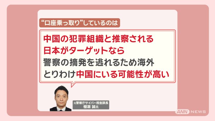 「中国の犯罪組織と推察される。日本がターゲットなら、警察の摘発を逃れるため海外、とりわけ中国にいる可能性が高い」といいます。