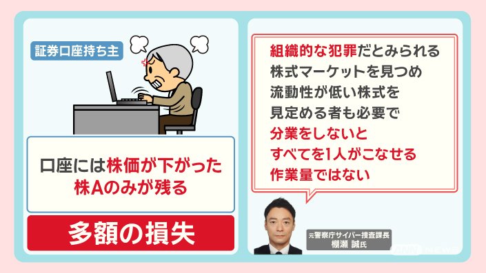 「乗っ取りは、組織的な犯罪だとみられる。株式マーケットを見つめ、流動性が低い株式を見定める者も必要で、分業をしないと、すべてを1人がこなせる作業量ではない」