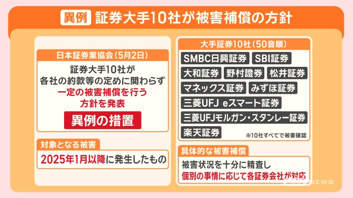 日本証券業協会は、証券大手10社が、各社の約款等の定めに関わらず、一定の被害補償を行う方針を発表しました。