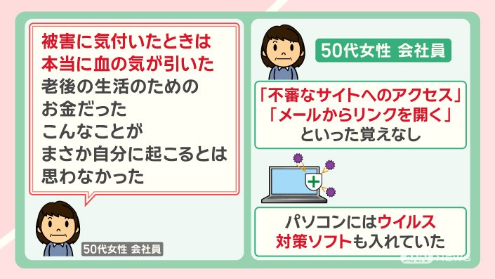 この女性は、『不審なサイトへのアクセス』『メールからリンクを開く』といった覚えはなく、パソコンにはウイルス対策ソフトも入れていた、ということです。