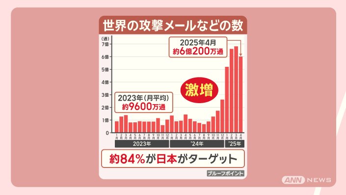 こうした攻撃メールは、世界全体で、2023年月平均で約9600万通でしたが、それが、2025年4月だけで約6億200万通、約7倍に増えています。