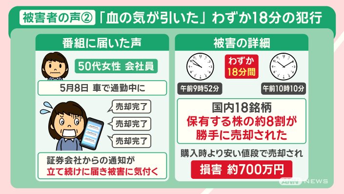 5月8日、車で通勤中に、証券会社から『売却完了』という通知が立て続けに届き、被害に気付きました。