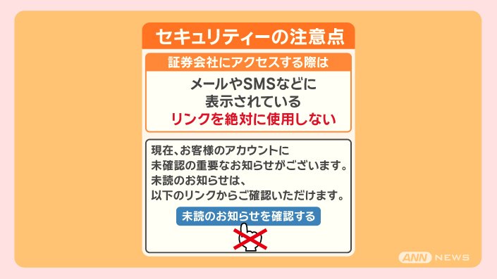 証券会社のウェブサイトにアクセスする際は、メールやSMS(ショートメッセージ)などに表示されているリンクを絶対に使用しない、ということです。