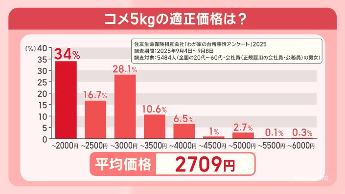 コメ5キロの適正価格は、いくらぐらいだと思うか調査したアンケートでは、平均価格が2709円で、今のコメの販売価格とは大きな開きがあるようです。