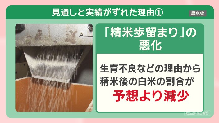 農水省の理由として、『精米歩留まりの悪化』をあげ、生育不良などの理由から精米後の白米の割合が予想より減少したとしています。