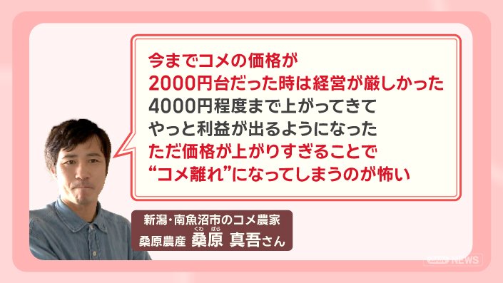 「今までコメの価格が2000円台だった時は経営が厳しかった。4000円程度まで上がってきて、やっと利益が出るようになった。ただ価格が上がりすぎることで、コメ離れになってしまうのが怖い」ということです。