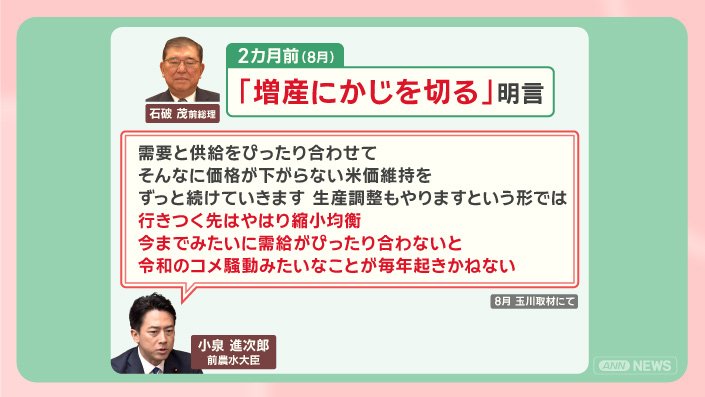 こうした状況の中、2カ月前、石破前総理はコメの「増産にかじを切る」と明言しました。