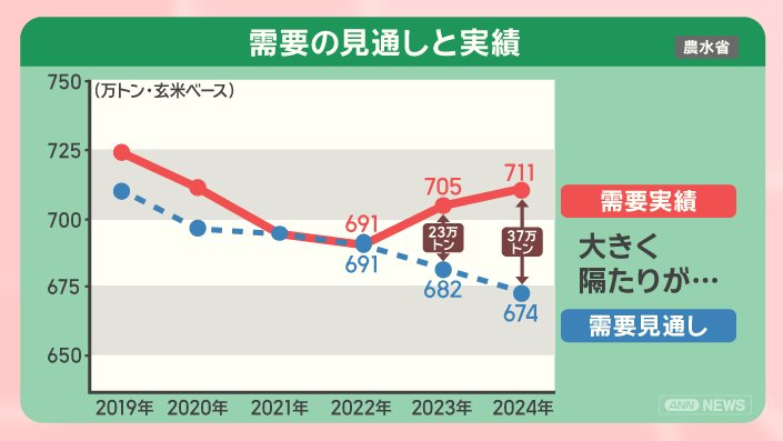 コメの需要の見通しと実績について、農水省の発表によりますと、コメの需要実績と需要見通しは2022年は同じ691万トンでしたが、それ以降、ズレが生じて、2024年は約37万トンの差があったということです。