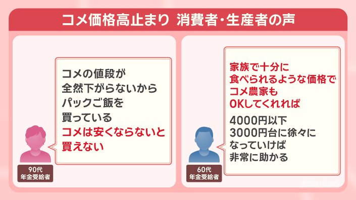 「家族で十分に食べられるような価格でコメ農家もOKしてくれれば、4000円以下、3000円台に徐々になっていけば、非常に助かる」と話しています。