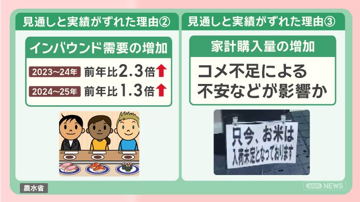 他にも、前の年と比べてインバウンドの需要が増えたことや、コメ不足による不安などの影響で、家計の購入量が増えたことなどをあげています。