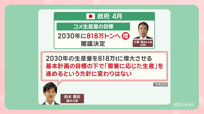 日本政府は4月にコメの生産量の目標を2030年に818万トンへ増やすと閣議決定しました。