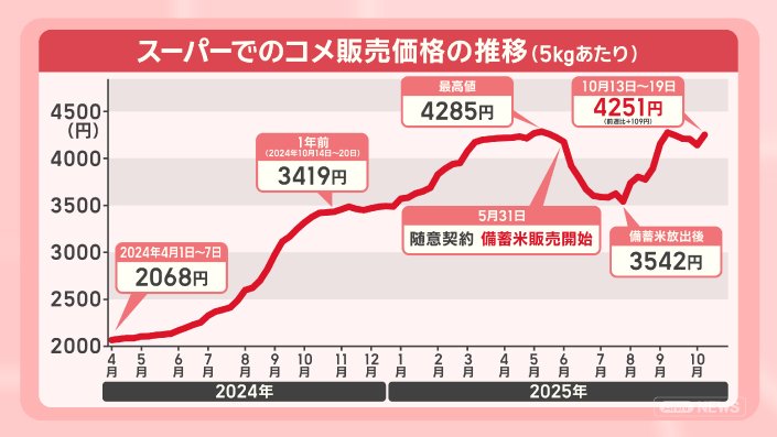 5月31日に随意契約の備蓄米の販売が始まると、コメの価格は、3542円まで下がりました。