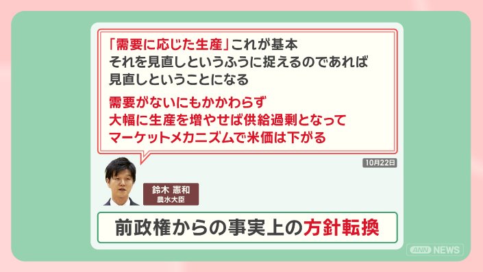 「『需要に応じた生産』、これが基本。それを見直しというふうに捉えるのであれば、見直しということになる。需要がないにもかかわらず、大幅に生産を増やせば供給過剰となって、マーケットメカニズムで米価は下がる」として、増産に舵を切った前政権からの事実上の方針転換を打ち出しました。