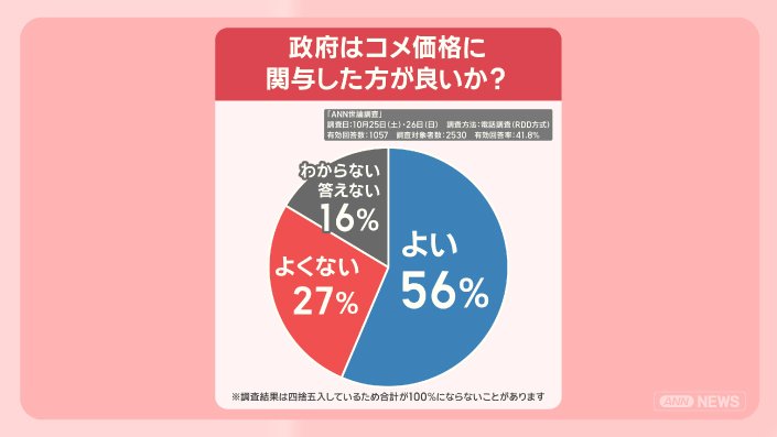 ANNの世論調査で「政府はコメ価格に関与した方が良いか?」という質問に56%の人が「よい」、27%の人が「よくない」と答えています。
