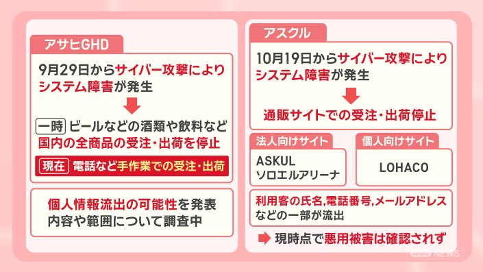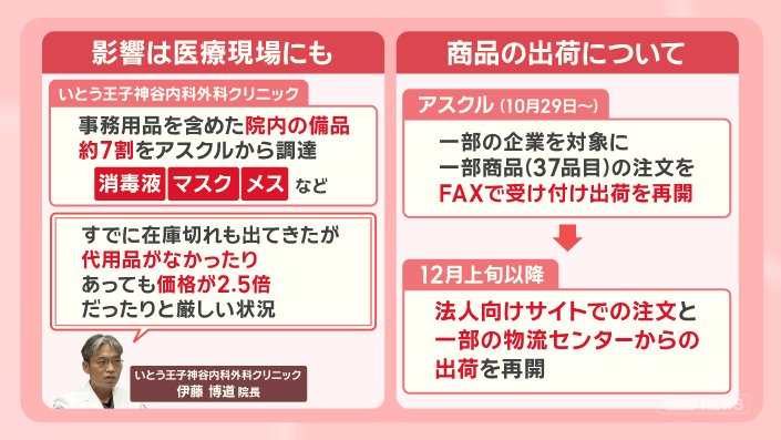 他にも、オフィス用品などの通販事業を手がける『アスクル』でも、10月19日からサイバー攻撃によるシステム障害が続いていて、通販サイトでの受注・出荷が停止しています。