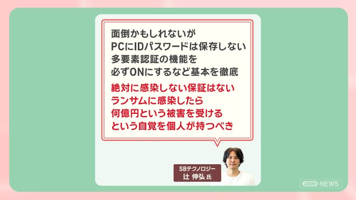 「面倒かもしれないが、PCにIDパスワードは保存しない、多要素認証の機能を必ずONにするなど、基本を徹底する。絶対に感染しない保証はない。ランサムウェアに感染したら、何億円という被害を受けるという自覚を個人が持つべき」