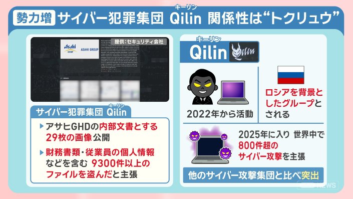 Qilinは、アサヒグループ・ホールディングスの内部文書とする29枚の画像を公開し、財務書類・従業員の個人情報などを含む9300件以上のファイルを盗んだと主張しています。